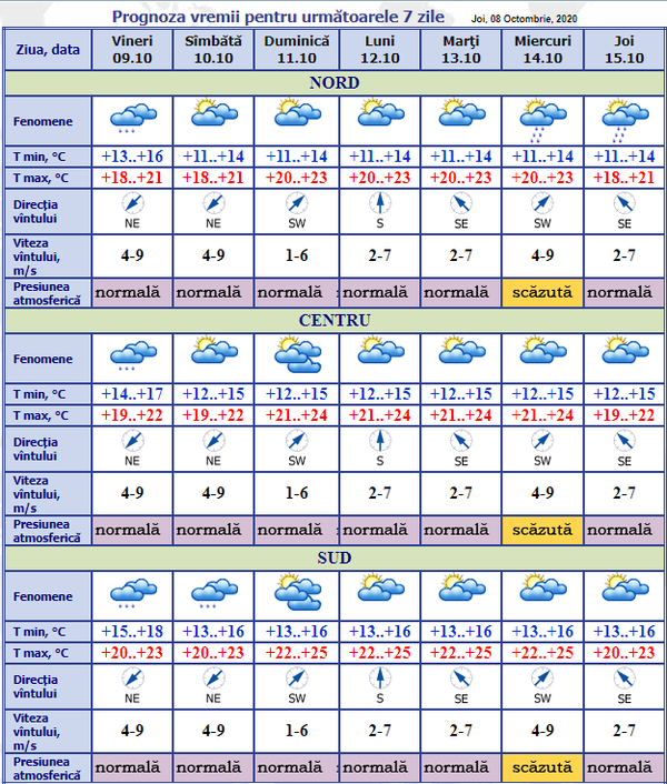 Ploi sunt anunțate de meteorologi și în zilele de vineri și sâmbătă, 9 și 10 octombrie. Vineri sunt posibile ploi slabe în toate regiunile. Sâmbătă va ploua în sud, fără tunete și fulgere.